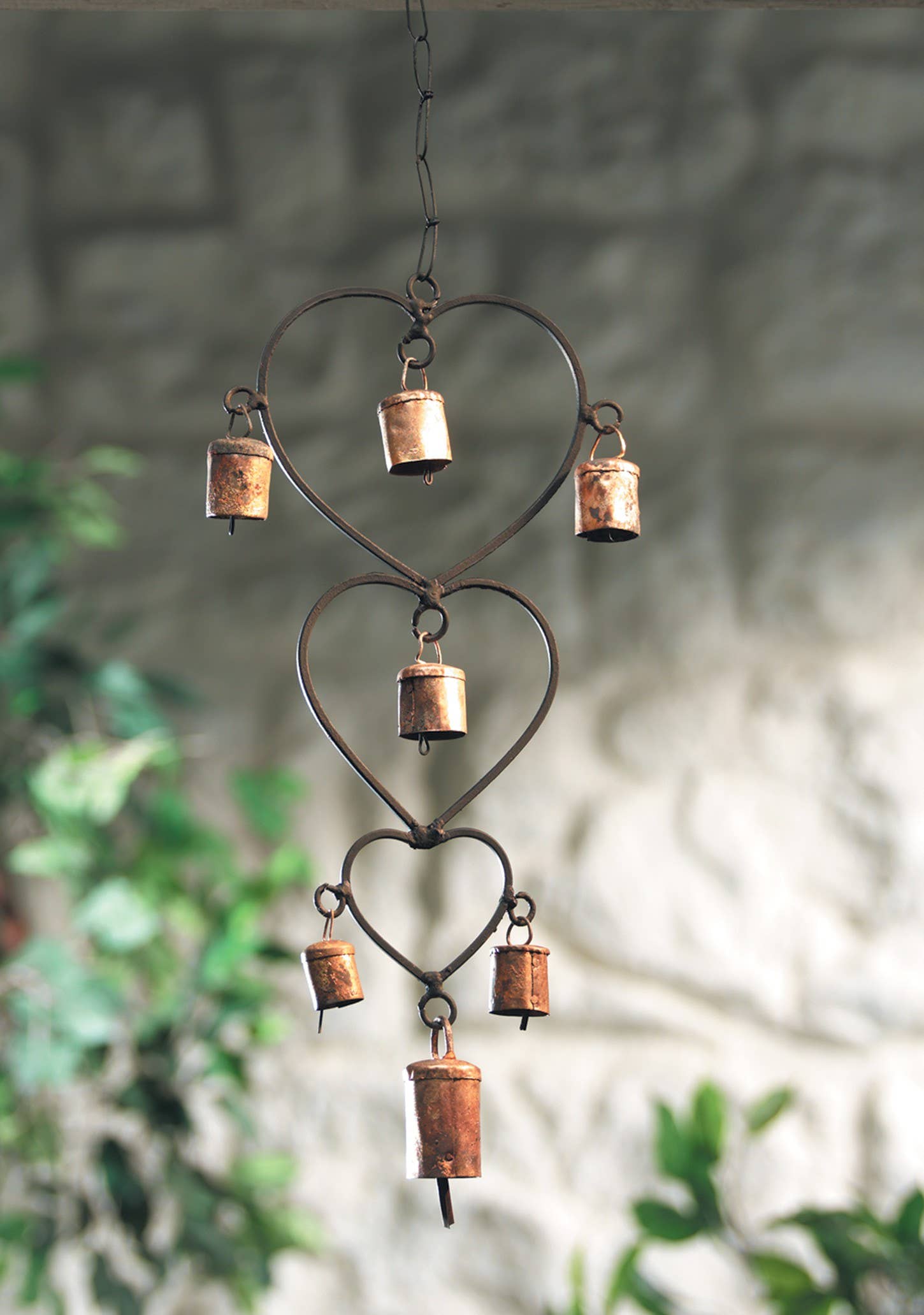 Three delicate hearts adorned with authentic brass-effect cow bells create a charming auditory accent. The black finish provides sophisticated contrast, while the miniature bells deliver gentle, melodic tones ideal for porches, gardens, or interior spaces seeking subtle movement and sound.